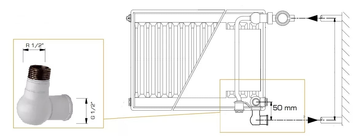 Montavimo metu panaudojus šią alkūnę prie Galant Uni 500 mm radiatorių, pajungimas tarp centrų taps 500 mm ir tokį radiatorių bus galima prijungti vietoje senų radiatorių daugiabutyje, nekeičiant vamzdyno išvadų.