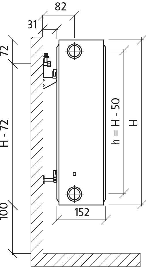Universalūs PURMO „Ventil Compact“ radiatoriai su profiliuotomis plokštėmis ir konvekciniais elementais, su šoniniais gaubtais ir viršutinėmis grotelėmis. Du apačioje ir keturi šone esantys prijungimo atvamzdžiai, sriegti iš vidaus G ½", suteikia galimybę jungti iš apačios, o prireikus ir iš šono. Radiatorius su „Oventrop“ pirminio reguliavimo termostatiniu vožtuvu. Medžiaga: aukštos kokybės štampuojamo neanglingojo valcuoto plieno skarda FePO 1 pagal EN 10130 Vertikalių vandens kanalų žingsnis: 33,3 mm Atvamzdžiai: 2 x G ½ " apatinio prijungimo dešinėje (kairėje - pagal užsakymą), 4 x G ½ " šoninio prijungimo Darbinis slėgis: 10 bar Maksimali temperatūra: 110 °C Bandymų slėgis: 13 bar Spalva: balta RAL 9016, kitos RAL paletės spalvos - pagal užsakymą Priklausiniai: tvirtinimo elementai, aklė, oro ventilis (įeina į komplektą) |
