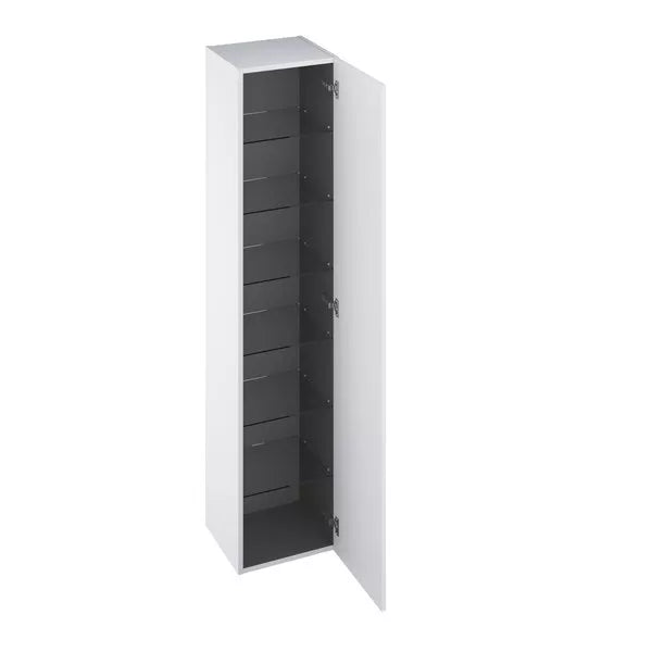 dydis (plotis x aukštis x gylis): 35 x 160 x 32 cm tipinis variantas: sukamas gaminys (kairė/dešinė) medžiaga: impregnuota plokštė MFPB ir MDF spalvotas korpusas: balta (blizgesys) lakuotų durelių spalva: balta (blizgesys) Rankena: metalinė balta - 1 vnt. (chromuotą galima įsigyti atskirai) garantija: 5 metaiAukšta spintelė SB Comfort 350 su šešiomis matinio stiklo lentynėlėmis. Vidinė spintelės erdvė yra grafito spalvos. Spintelė standartiškai yra su baltomis rankenomis, kurias galima pakeisti papildomai įsigyjamomis, chromu dekoruotomis rankenomis.
