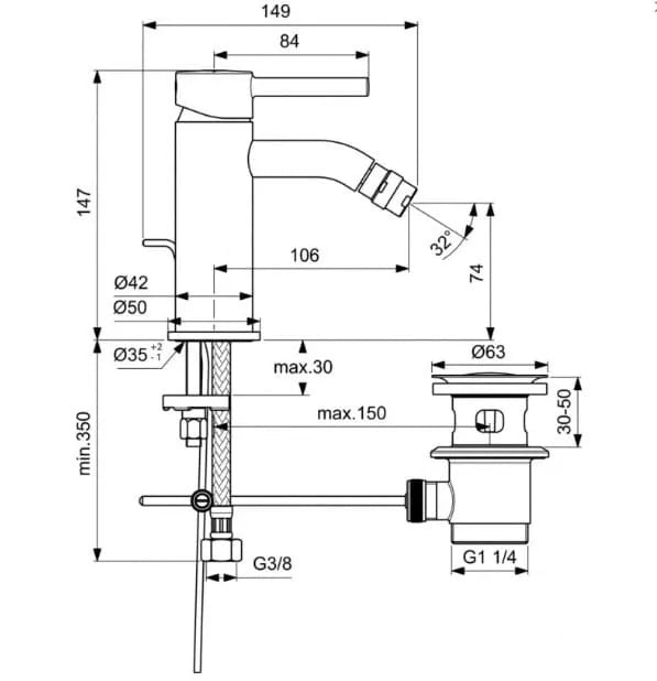Ceraline vieno angos bidė maišytuvas su metaliniu pop-up atliekų vožtuvu, naudojantis 28 mm keraminiu vožtuvu FirmaFlow su karšto vandens ribotuvu. Su metaline rankena su raudona ir mėlyna spalvos indikacija, lanksčiomis G3/8" žarnomis vandens tiekimui ir Perlator aeratoriumi su rutulinio sujungimo mechanizmu ir 3.8 l/min srauto ribotuvu. Naudoja Easy-fix tvirtinimo sistemą.