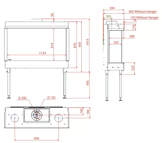 Židinys į kaminą jungiamas 130/200 mm skersmens dūmtraukiu. Vidiniu dūmtraukio skersmeniu degimo produktai (dūmai) šalinami , o išoriniu skersmeniu - tiekiamas oras degimo palaikymui, todėl židinio patalpoje esantis oras išlieka gaivus.