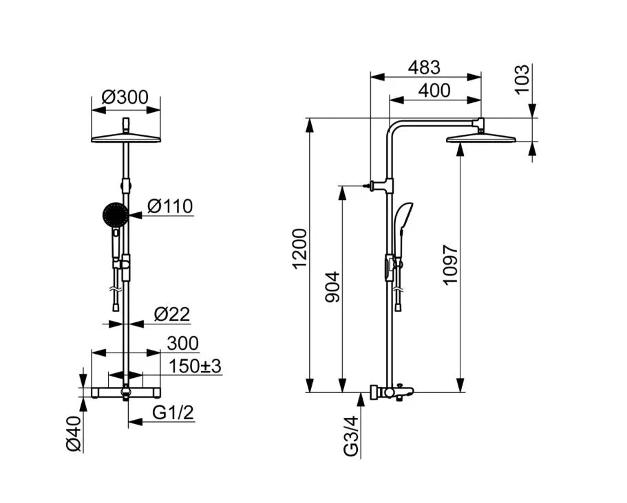 Rankinis dušas, dušo stovas, sukiojamas lietaus dušo galva, užrakinamas ties viduriniąja pozicija, reguliuojamas dušo stovo laikiklis, dušo žarna (1750 mm), montavimo komponentai, sukiojama rutulinė jungtis, antikalkinė technologija, apsauginė žarnos kasetė