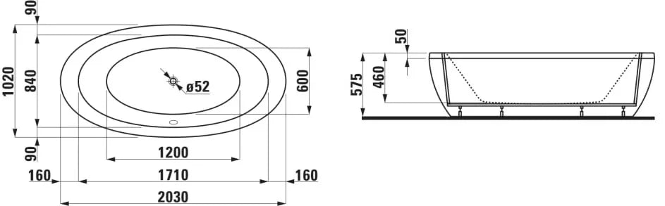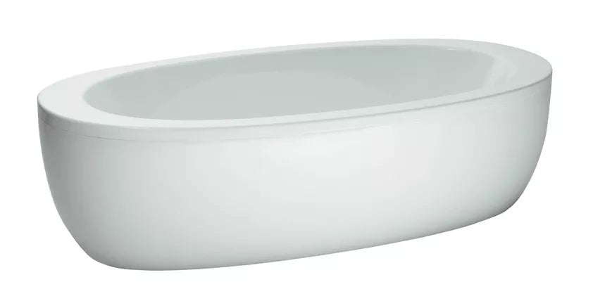 Laisvai statoma vonia, ovali, su aliuminio rėmu ir viso perimetro uždengimu, su centriniu nuotaku, iš sanitarinio akrilo.