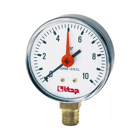 Kompaktiškas sausas manometras, skirtas vandens, oro ir kitų neutralių terpių slėgio kontrolei šildymo, vandentiekio ir pramoninėse sistemose. Ø63 mm ciferblatas su dviguba skale (bar/psi) aiškiai matomas, 1/4″ išorinis sriegis leidžia greitai sumontuoti radialinėje (apatinėje) padėtyje. Gamintojo kodas: 0318216.