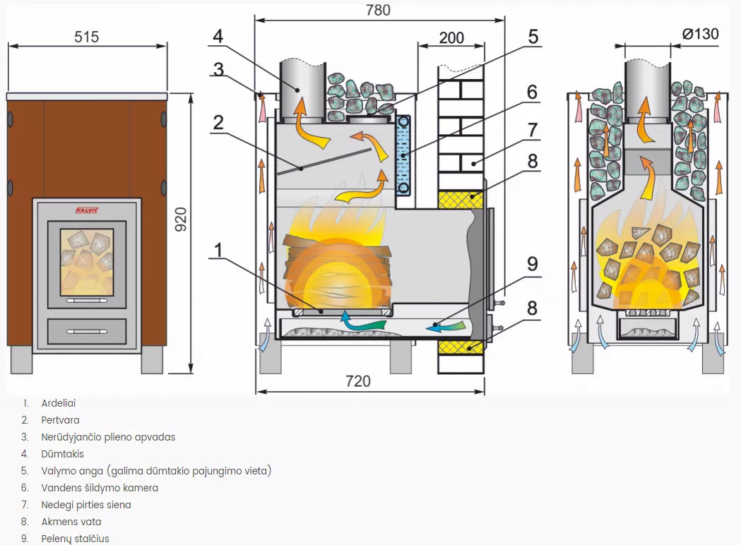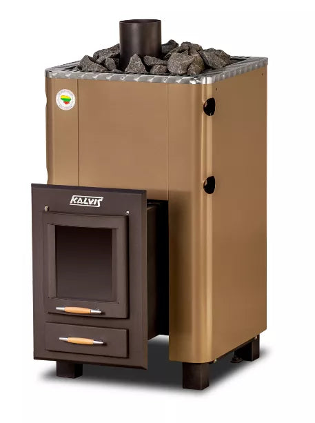 Pirties krosnelė su išorine pakura Kalvis PR2-S skirta vidutinio dydžio pirties patalpai - nuo 12 iki 32 m3. Kūrenama iš priepirčio. Po degimo kamera yra pelenų stalčius.