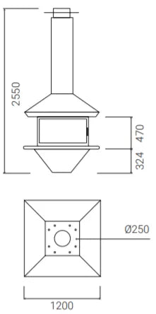 Židinys tvirtinamas prie lubų, be pagrindo. Degimo kamera su vitro keraminiu stiklu per visą perimetrą, padalintu į kelias dalis patogesniam malkų įdėjimui bei priežiūrai.