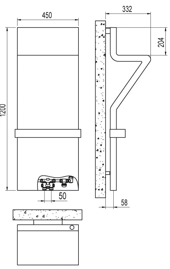 Komplektacijoje yra: hidrauliniai pajungimai prie daugiasluoksnių ir varinių vamzdžių, tvirtinimai prie sienos, rankšluosčių laikiklis, nuorintojas.