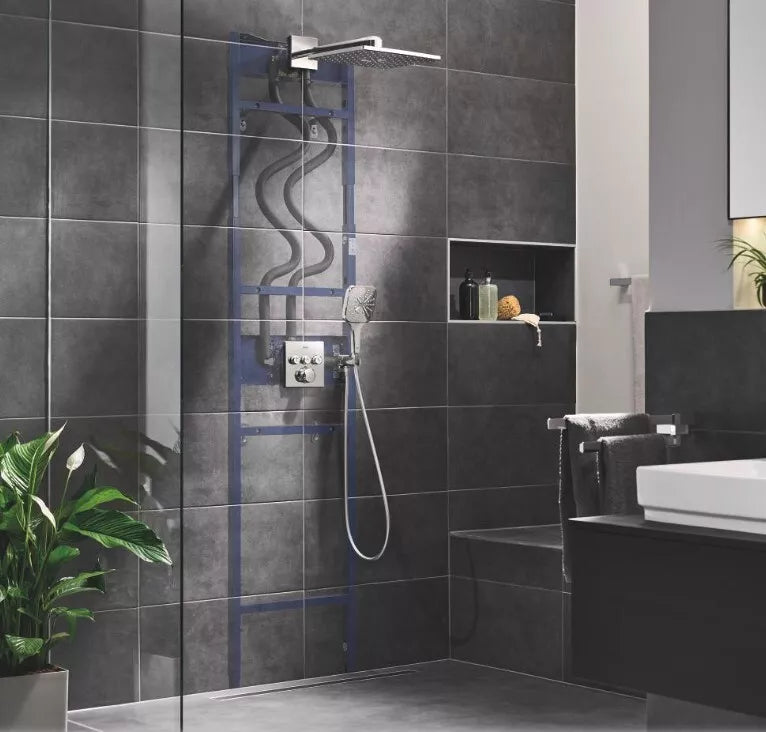 Norint sukurti svajonių vonios kambarį su potinkine dušo sistema, pilnai sukomplektuotas GROHE Rapido potinkinis rėmas dušui – puikus pasirinkimas. Komplektaciją sudaro: potinkiniai išvadai lietaus galvai* ir rankiniam dušeliui; sumaišyto vandens vamzdžiai, GROHE Rainshower Universal potinkinė dėžutė su 2 išėjimais lietaus galvai su dvejomis srovėmis (kiekviena su maksimaliu 9,5 l/min srautu) ir GROHE Rapido SmartBox universalaus montavimo potinkine dėžute su 2 apatiniais išėjimais, viskas iš anksto gamykliškai sumontuoti – ir puikiai tinka mūsų atskirai parduodamoms Grohtherm potinkinėms dušo sistemoms 1039970000 bei 1039980000.