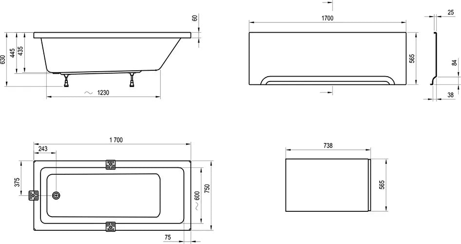 matmenys: 170 x 75 cm medžiaga: lietas akrilas tipinė versija: Slim - plonas viršutinis kraštas 18 mm aukščio sutvirtinimas: LA - stiklo pluoštas tūris: 208 l vonios sienelė: VS2, VS3, VS5, PVS1, CVS2, BVS1, BVS2 papildomi priedai: atrama, panelė (priekinė, šoninė), apdailos plokštės tvirtinimo komplektas, vonios nutekėjimo komplektas
