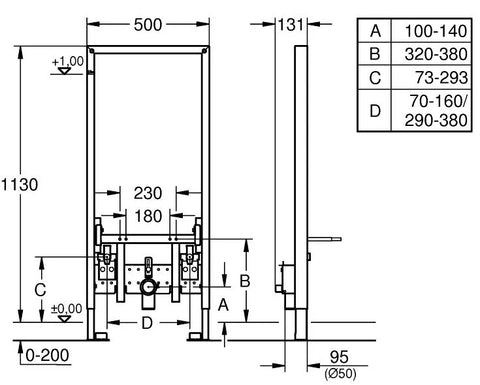 Milteliniu būdu dažytas tvirtas rėmas su dviem reguliuojamomis atramomis tvirtinti prie grindų, 0-200 mm Du tvirtinimo varžtai ir veržlės M 12 Reguliuojama nuotekų pajungimo vieta Nuotekų alkūnė DN 40/50 su gumine tarpine, guminis perėjimas 30/50 (galima naudoti kaip tarpinę), su apsauginiu kamščiu