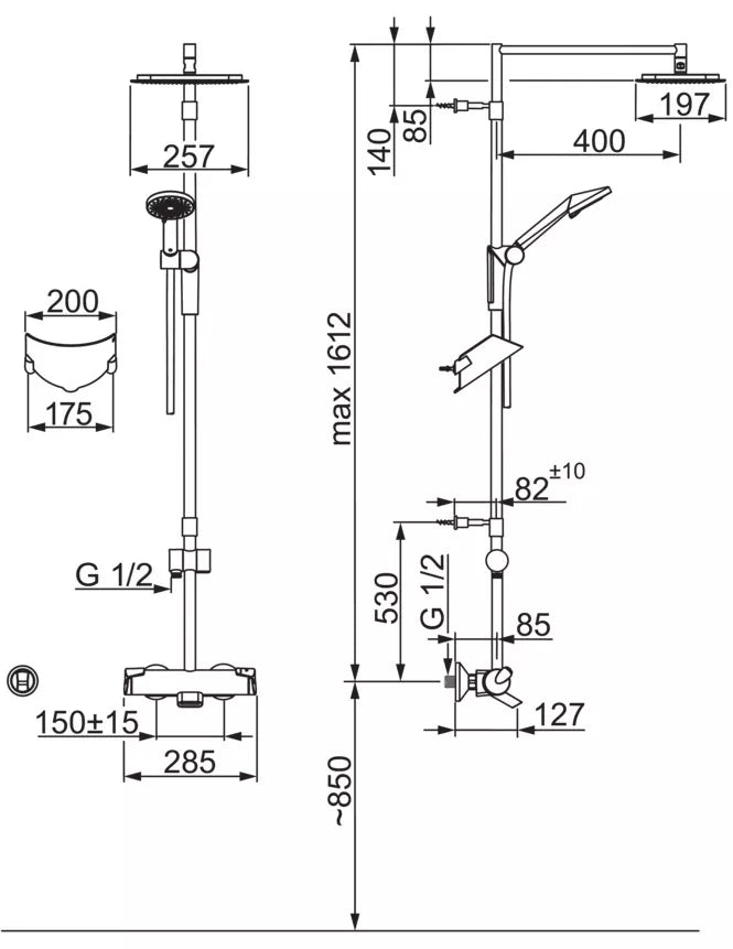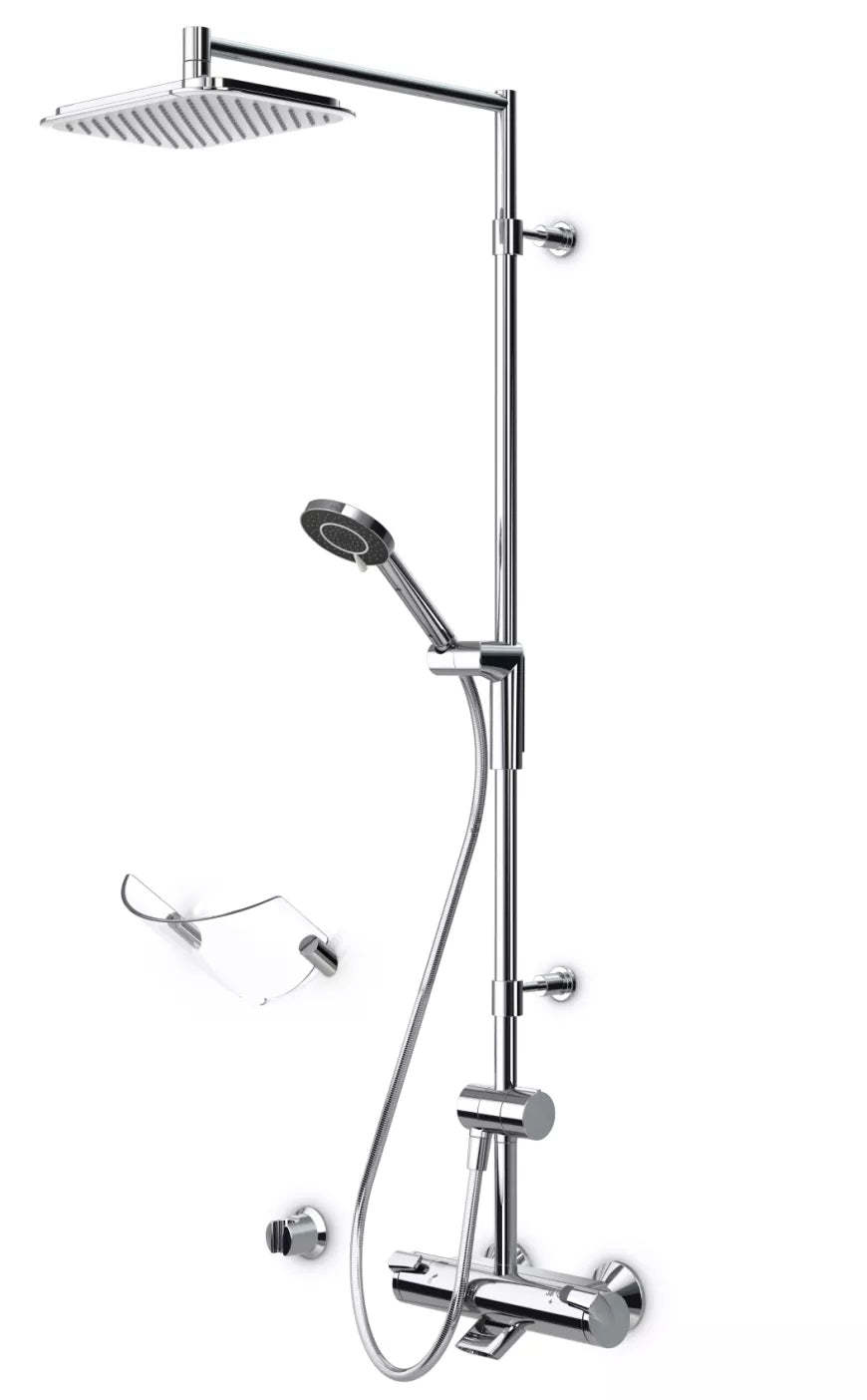 Termostatinė lietaus dušo sistema su patogiomis suimti rankenėlėmis, rankiniu dušu ir snapu. Rankenėlėje sumontuotas lengvai naudojamas perjungiklis ir temperatūros ribotuvas. Įdiegta taupymo funkcija EcoFlow. Yra padidinto komforto antikalkinis rankinis dušas su daugiafunkciniu srovės reguliavimu, dušo slankiklis ir dušo sieninis laikiklis. Maišytuvas komplektuojamas su dangteliais, ekscentrinėmis jungtimis, filtrais ir atbuliniais vožtuvais.