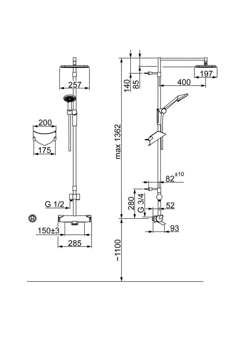 Termostatinė lietaus dušo sistema su patogiomis suimti rankenėlėmis, rankiniu dušu ir snapu. Rankenėlėje sumontuotas lengvai naudojamas perjungiklis ir temperatūros ribotuvas. Įdiegta taupymo funkcija EcoFlow. Yra padidinto komforto antikalkinis rankinis dušas su daugiafunkciniu srovės reguliavimu, dušo slankiklis ir dušo sieninis laikiklis. Maišytuvo dangteliai 203504/2 ir ekscentrinės jungtys 203105/2 užsakomi atskirai.
